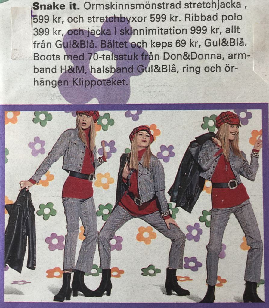 1-2) inga uppgifter. 3) Monika Storåkers, Per Hessman. 4) Inga Uppgifter. 5) Cecilia Tivar, Jonas Ingerstedt. 6) inga uppgifter. 7) Irene Hynes, Johan Carlsson. 8-9-10-11) inga uppgifter. 12-13) Inger Martin, Guido Hildebrand. 14) Expressen. 15) Eva Lindh, Tony Fernandez. 16-17) inga uppgifter. 18) Elisabeth Debong, Stefan Andersson. 19) Vecko Revy. 20) inga uppgifter. 21) Clic, Lennart Durehed. 22) Ann Jonsson , David Pihlblad. 23) Siroun Forsberg, Tomas Giden. 24) inga uppgifter. 25) Frida. 26) Guido Hildebrand. 27) Lothar Schmidt. 28-29-30) inga uppgifter. 31) Eva Lindh, Jenny Arnbäck. 32-33-34) inga uppgifter. 35) Anna Zethraeus, Åsa Tällgård. 36) Vecko Revy. 37) Eva Lindh, Christer Flodqvist. 38) Gunilla Thermaenius, Magnus Malmberg. 39-40) Anna Zethraeus, Charlotte Lesche. 41) inga uppgifter. 42-43) Frida, Thomas Håkansson, Pia Johansson. 44-45) inga uppgifter. 46) Frida. 47) Carl Hederoth, Anders Thessing. 48) Elisabeth Debong, Tomas Giden. 49) Elisabeth Debong, Guido Hildebrand. 50-51) inga uppgifter. 52) Irene Hynes, Johan Carlsson. 53) Rita Andersson, Åke Sandström. 54) Anders Thessing. 55) Jennifer Lagerkrantz, Joakim De Groot. 56) inga uppgifter. 57) Guido Hildebrand. 58) Micael Bindefeld, Carlo Bosco. 59-60) Vecko Revy. 61) Elle. 62) Anette Tamm. 63) Vecko Revy. 64-65-66-67) inga uppgifter. 68) Okey. 69-70-71) Vecko Revy, Agneta Hellstedt, Matz Widen. 73-74-75) inga uppgifter. 76-77-78-79) Vecko Revy, Mats Fridehäll, Tomas Giden. 80) Martina Bonnier, Kent Billeqvist. 81) Eva Lindh, Tony Fernandez. 82-83-84) inga uppgifter. 85) Agneta Hellstedt, Matz Widen. 86) inga uppgifter. 87) Blenda Ulander, Kent Billeqvist. 88-89) Femina. 90-91) inga uppgifter. 92) Tony Fernandez. 93-94) Minna Ribbing, Magnus Elgqvist. 95) Micael Jansson. 96-97-98) inga uppgifter. 99-100) Vecko Revy. 101-102-103-104) Vecko Revy, Lisa Lindqvister, Tony Fernandez. 105) inga uppgifter. 106) Elle, Mattias Edwall. 107) Eva Lindh, Tony Fernandez. 108-109) Vecko Revy, Lisa Lindqvister, Christopher Dracke. 110) Guido Hildebrand. 111-112-113) inga uppgifter. 114) Ehva Norberg, Tony Fernandez. 115) Hans Feurer. 116-117) inga uppgifter.